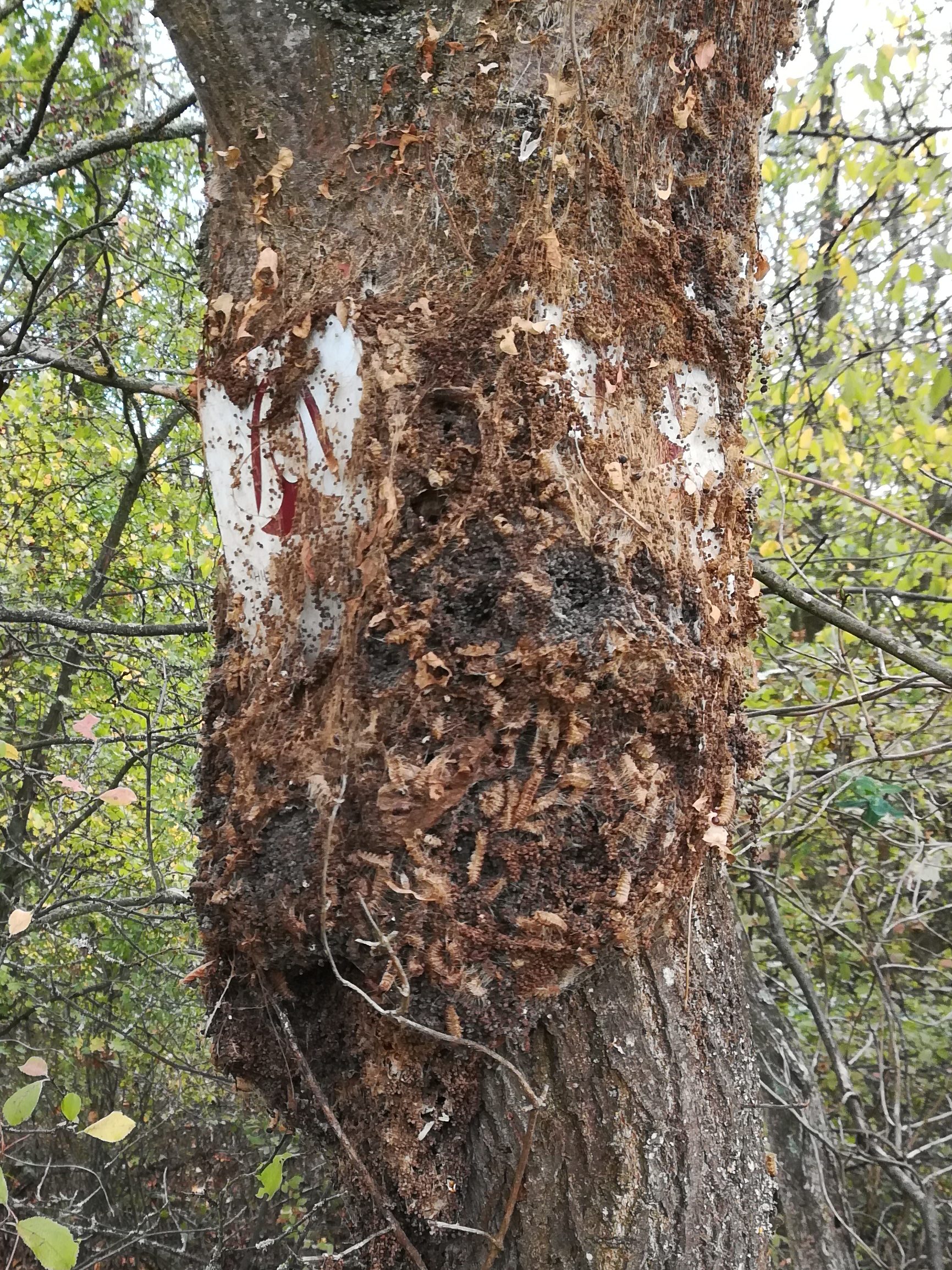 Auf meinem Weg sah ich immer wieder Schilder, die vor den allergieauslösenden Eichenprozessionsspinnern (Thaumetopoea processionea) warnten. Ich wollte dann gern wissen, wie diese aussehen, schaute gleichzeitig aber auch nicht genauer hin und lief weiter. Heute war ein solches Warnschild direkt an einem alten Nest der Raupen. „Super positioniert das Schild, endlich sieht man mal direkt wie es aussieht“, dachte ich. Dann vielen mir noch ganz viele weitere der massigen Nester auf und ich erkannte, dass das Schild wahrscheinlich schon länger dort ist und sich die Raupen zufällig dort verpuppt haben. Sah schon ein bisschen gruselig aus aufgrund der Größe und Vielzahl der Nester.