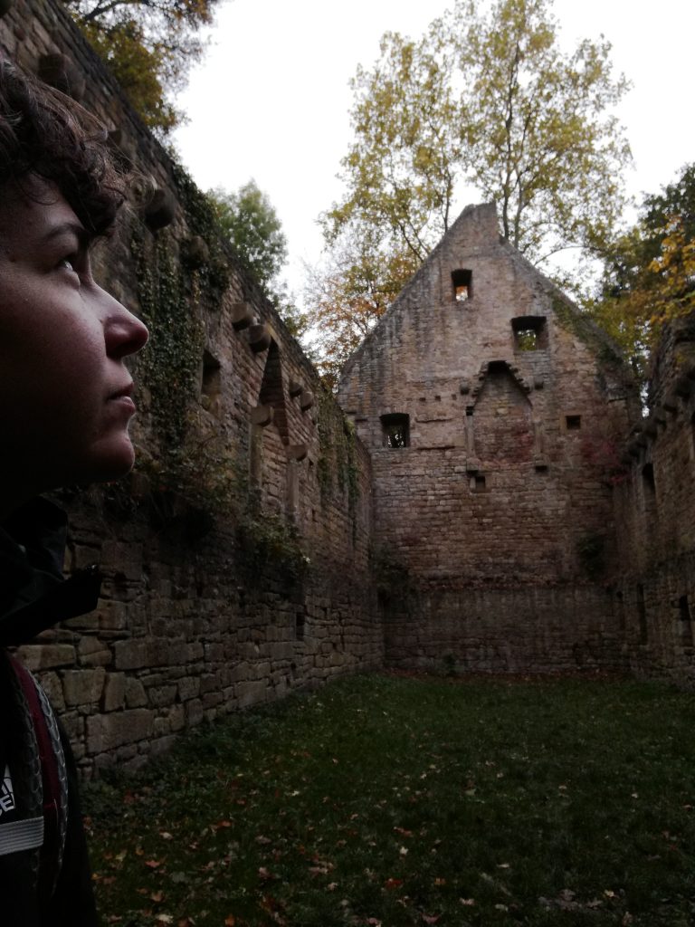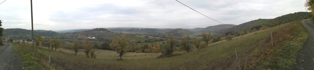 Ich habe mehrfach durchgerechnet, weil ich die Distanz auch nicht glauben konnte. Beim gestrigen Überschlagen waren es noch 22 km. Jetzt verstehe ich auch, warum mir Füße und Beine schmerzen. Heute habe ich die Zeit aufgeholt, die ich durch die Zweiteilung der ersten Etappe verloren hatte. Ich war heute in der Klosterruine Disibodenberg, wo Hildegard damals mit 14 Jahren aufgenommen und ausgebildet wurde. Ich habe mir für diesen beeindruckenden Ort viel Zeit genommen. Danach war ich erstaunt wieviel Weg laut Schild noch vor mir liegen soll. Daher hetzte ich los die Weinberge rauf und runter. Belohnt wurde ich durch die bisher weiteste Sicht auf umliegende Berge und Täler. Als es langsam dämmerte, begann ich zu singen, um die Wildschweine fernzuhalten. Aber die Puste ging mir aus, also Selbstgespräche. Am Ende ließ ich mein Handy singen. 19 Uhr war ich endlich in der Unterkunft und gönnte mir eine reichhaltige Mahlzeit. Zum ersten Mal kam ich mit anderen Pilgern ins Gespräch über Hildegard, Visionen und die heutige Gesellschaft. Morgen ist Ausschlafen angesagt.